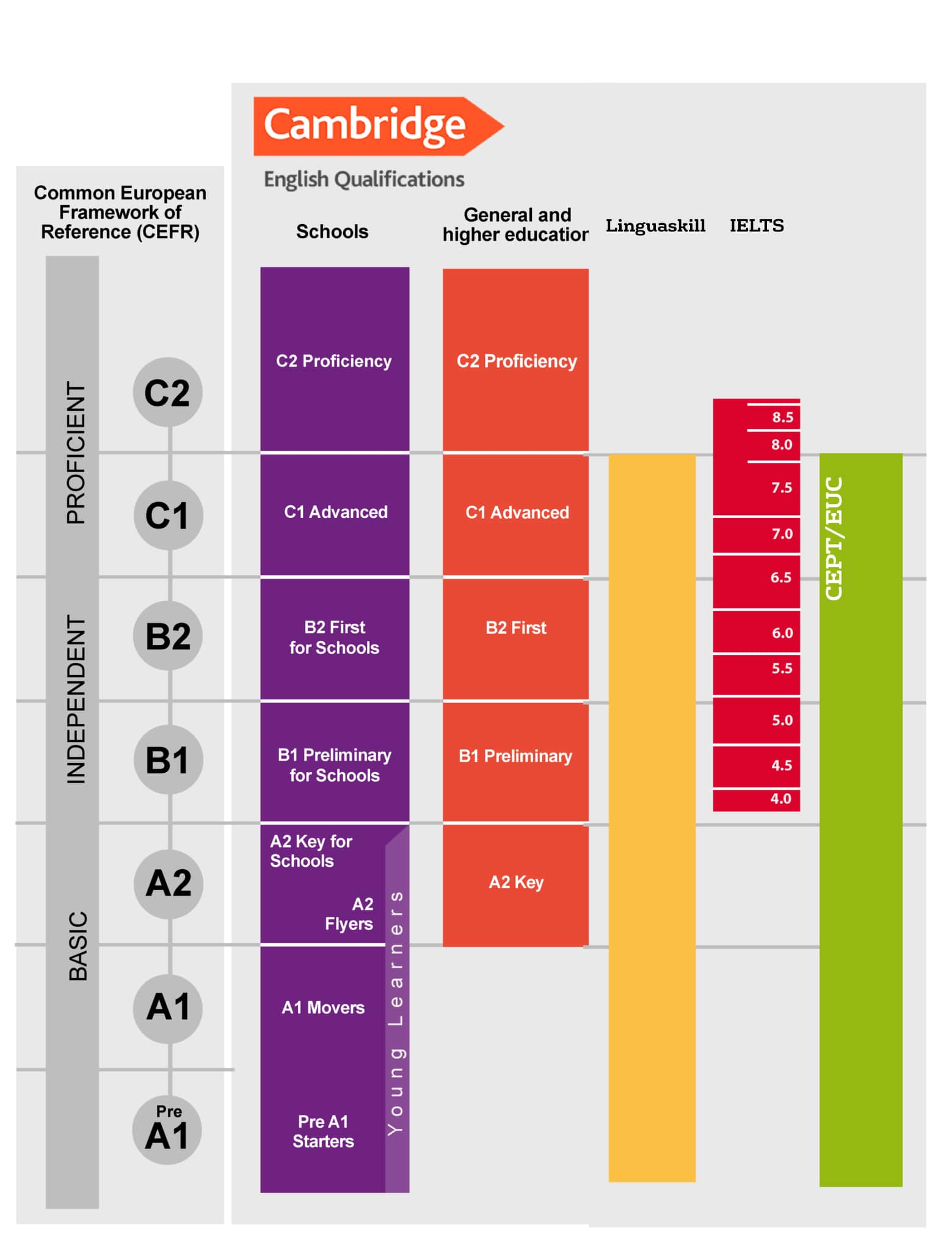 Desde 1913 Cambridge ha estado evaluando a candidatos en inglés y cuenta con el mayor equipo de investigación dedicado exclusivamente al desarrollo y calidad de sus exámenes. Los exámenes de Cambridge son aceptados por miles de universidades en todo el mundo además de gobiernos y empresas.
